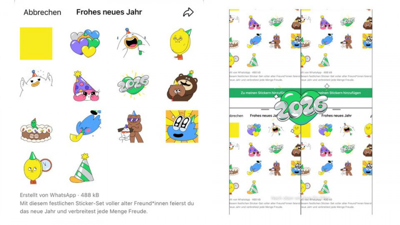 In Chats und im Status gibt es ein festliches Sticker-Paket. Die animierten Sticker zeigen etwa eine Zitrone mit Partyhut, ein grünes Herz mit einem 2026-Ballon, feiernde Cartoon-Tiere oder eine Sammlung von herzförmigen Luftballons.