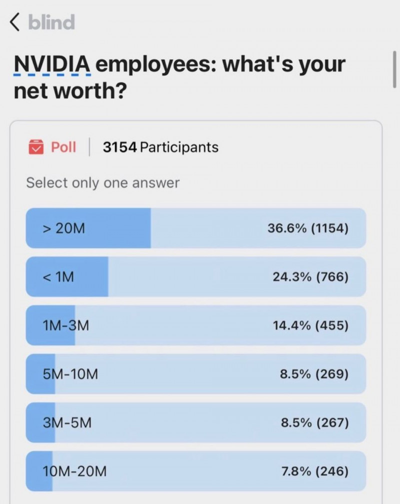 Dem Mythos liegt wohl eine Umfrage auf der Website "Blind" aus dem März vergangenen Jahres zugrunde. Dort wurde gefragt: "Nvidia-Mitarbeiter: Wie hoch ist Euer Vermögen?"