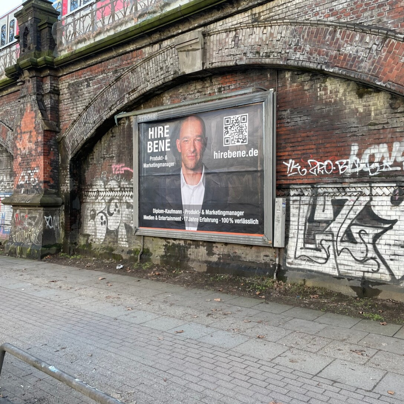 Nach 70 erfolglosen Bewerbungen ging der Marketingmanager neue Wege, um Arbeitgeber auf sich aufmerksam zu machen. Grasmanns Eckdaten in Kürze: Jahrgang 1979, abgeschlossenes BWL-Studium und langjährige Erfahrungen als Marketing- und Produktmanager in der Unterhaltungsbranche. Daher weiß er auch, wie er auf sich aufmerksam machen kann: Er startete Anfang dieses Jahres eine Plakataktion und blickte in seiner Heimatstadt an neun Standorten im XXL-Format zehn Tage von Werbeflächen auf die vorbeilaufenden Menschen.
