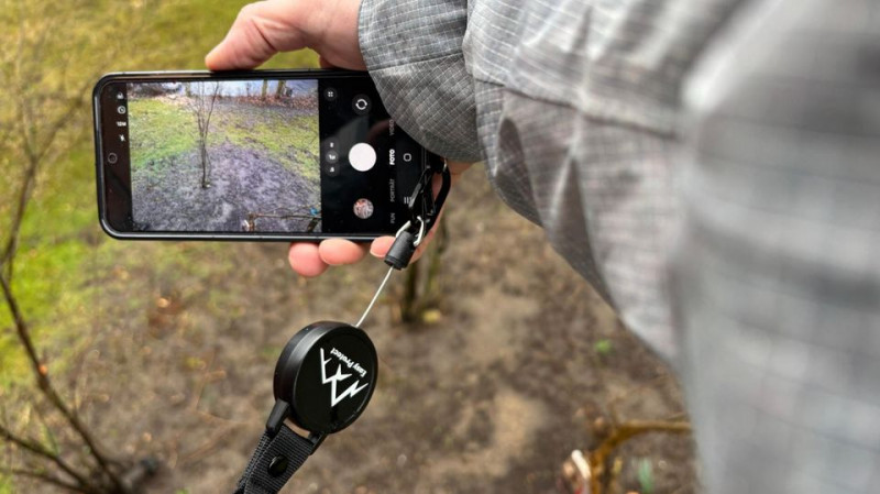 Im ersten Sturztest hängen wir den Karabiner in der Gürtelschlaufe einer Jeans ein und stecken das Smartphone in die Tasche. Das flutscht besser – sieht aber etwas merkwürdig aus. Beim Selfie lassen wir das Handy absichtlich aus etwa 1,80 Metern aus der Hand fallen. Im ersten Versuch schlägt es uns gegen das Knie, im zweiten Anlauf touchiert es den Oberschenkel. Dafür ist diese Option eine sichere Bank, um Langfingern eine lange Nase zu zeigen. Denn die kommen mit der vermeintlich leichten Beute nur maximal 80 Zentimeter weit.