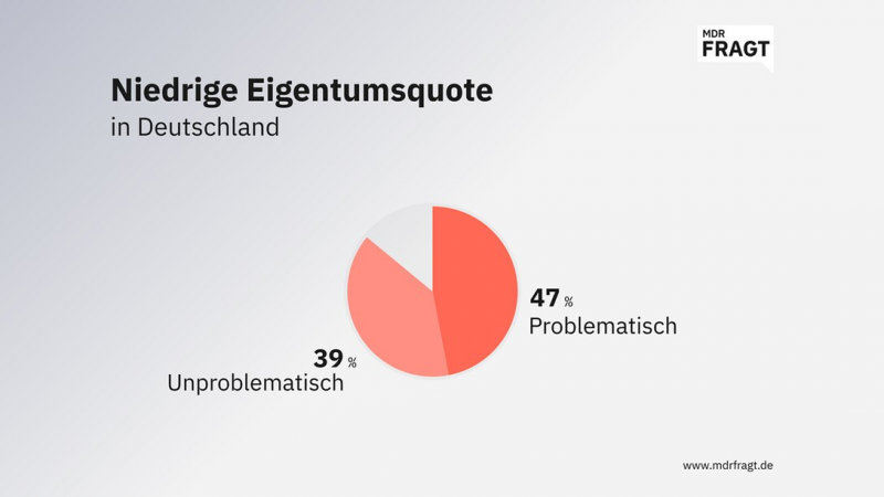 Bei der Frage, ob diese vergleichsweise geringe Eigentumsquote in Deutschland problematisch ist oder nicht, gehen die Meinungen in der MDRfragt-Gemeinschaft auseinander. So halten 47 Prozent diese für problematisch während 39 Prozent darin kein Problem sehen.
